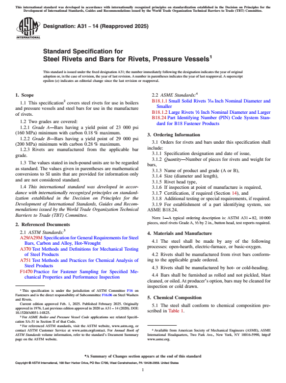Standard Specification for Steel Rivets and Bars for Rivets, Pressure Vessels 1