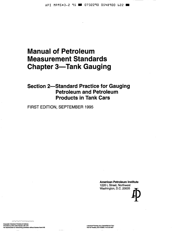 Manual of Petroleum Measurement Standards Chapter 3 - Tank Gauging Section 2 - Standard Practice for Gauging Petroleum and Petroleum Products in Tank Cars First Edition; Replaces STD 2545 R(2000)