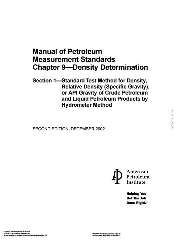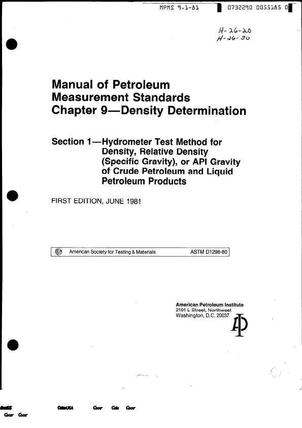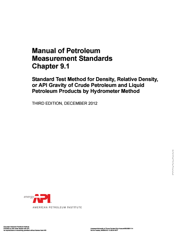 Manual of Petroleum Measurement Standards Chapter 9 - Density Determination Section 1 - Hydrometer Test Method for Density, Relative Density (Specific Gravity), or API Gravity of Crude Petroleum and Liquid Pet