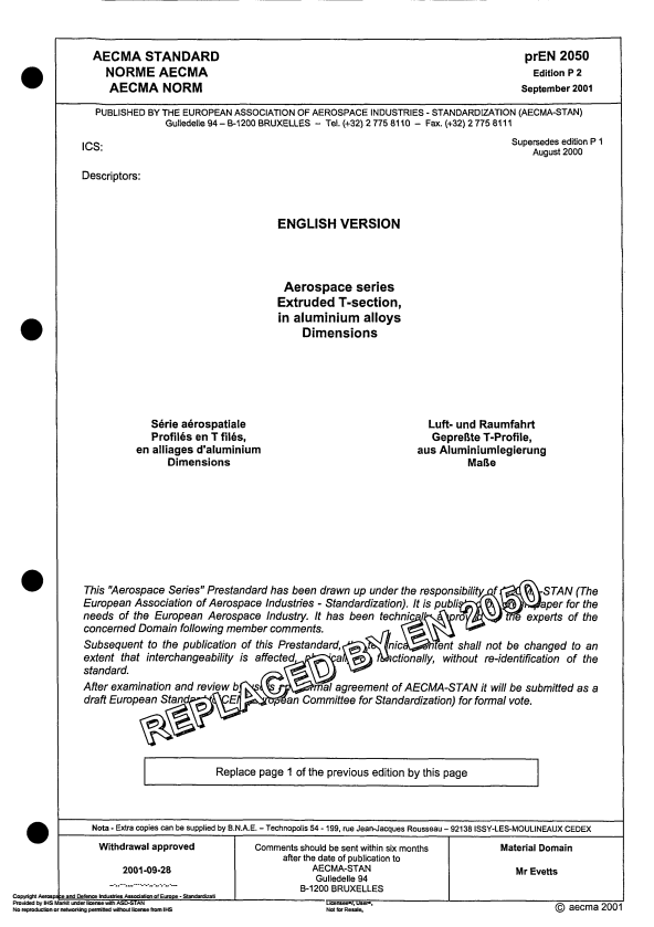 Aerospace Series Extruded T-Section, in Aluminium Alloys Dimensions - Edition P 2; Supersedes Edition P 1: August 2000